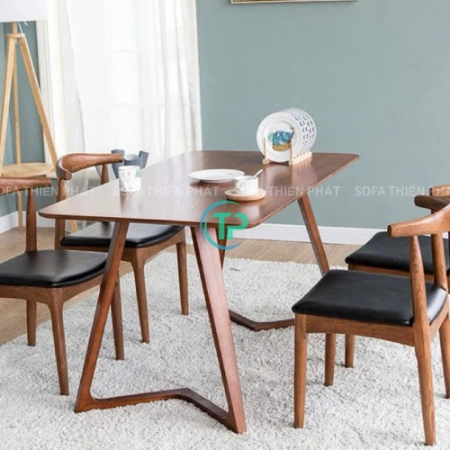 • Chất liệu: Khung gổ cao su, mặt gỗ MDF phủ veneer, ghế bọc nệm
